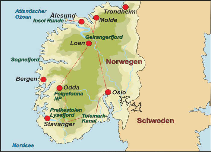Das Wanderland Norwegen punktet mit ursprünglicher Natur und einer schier unglaublichen landschaftlichen Vielfalt. Tief in das Land eingeschnittene Meeresarme, die von Gletschern ausgeformten Fjorde, zeugen von der gewaltigen Kraft des Eises und bilden einen scharfen Kontrast zu den steil aufragenden grünen Hängen, die sich unmittelbar aus dem Wasser erheben. Die Steilhänge setzen sich nahtlos fort zu den, bis über 2400 Meter hoch ragenden schroffen Gipfeln der Fjells, der norwegischen Gebirge.