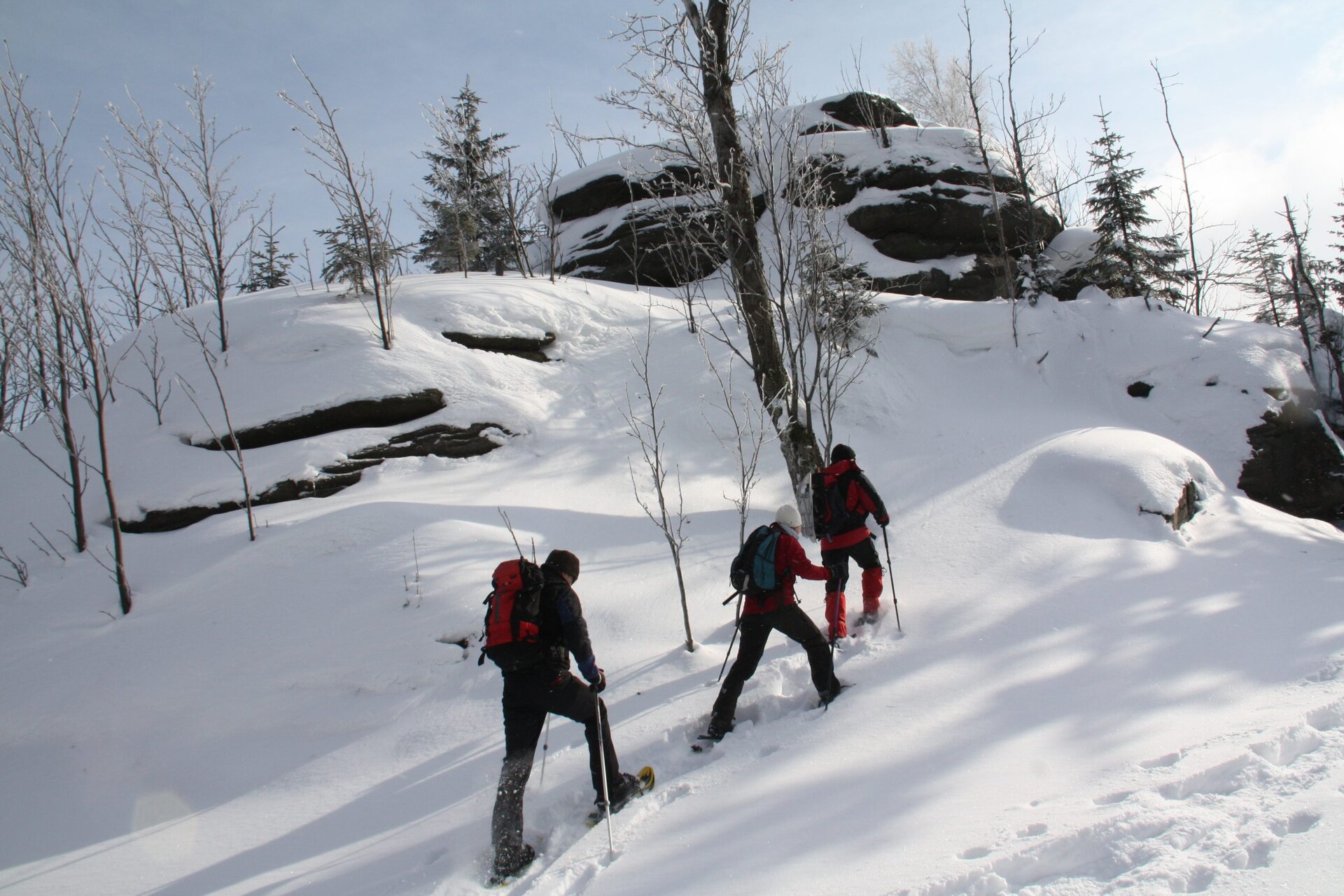 Unsere Schneeschuhwanderungen (Gehzeiten 4-6 Std.) führen über verschneite Wiesen, Sie durchstreifen Wälder und können von Berggipfeln und markanten Felsen tolle Ausblicke genießen. Erleben Sie die reizvolle Winterlandschaft des Isergebirges einmal in einer neuen Dimension. Genießen Sie das Stapfen durch den Schnee und die Blicke über malerische Felsenformationen und weißglänzende Berge. Seit altersher sind Schneeschuhe ein Fortbewegungsmittel in schneereichen Regionen. Heute wiederentdeckt, sind sie ideale Begleiter um aktiv die Winterlandschaft zu erkunden. Unsere Schneeschuhtouren versprechen Genuss und Naturerlebnis zugleich. Probieren Sie es aus!